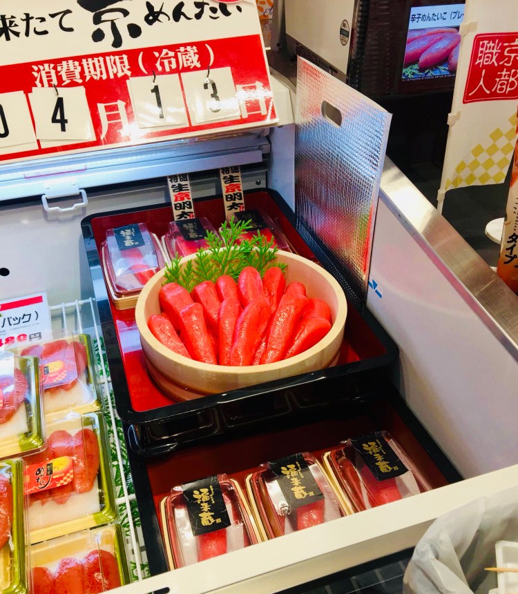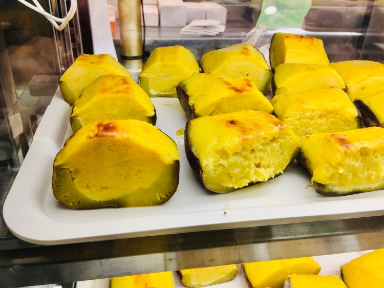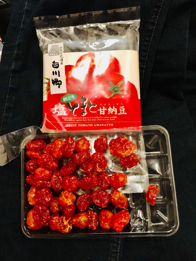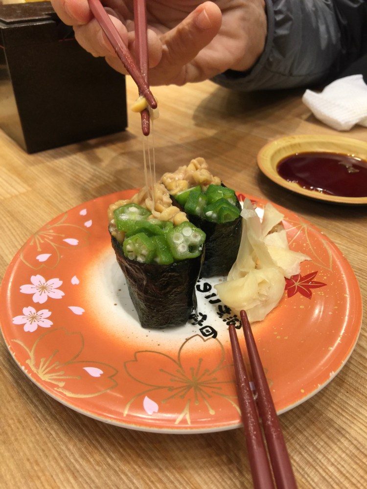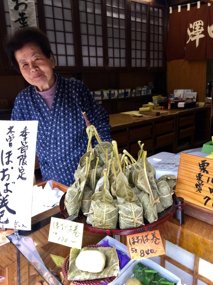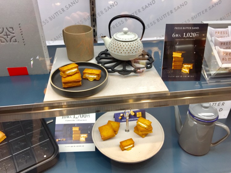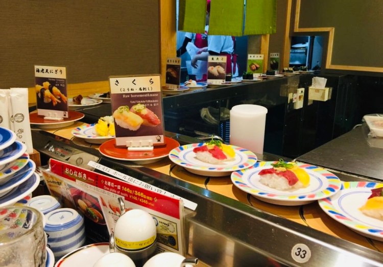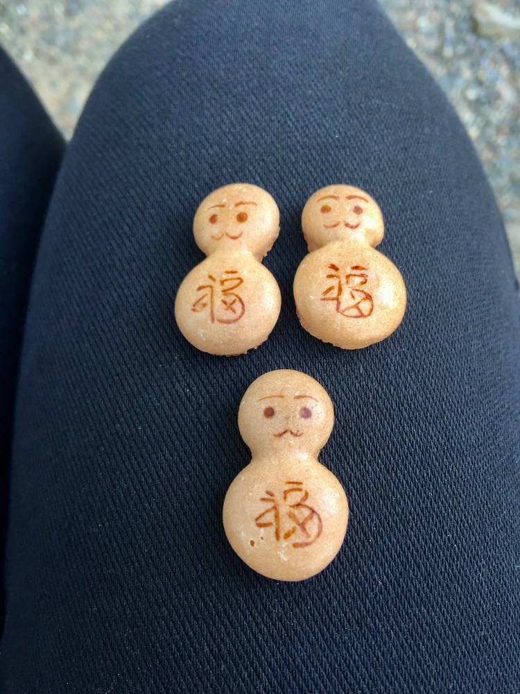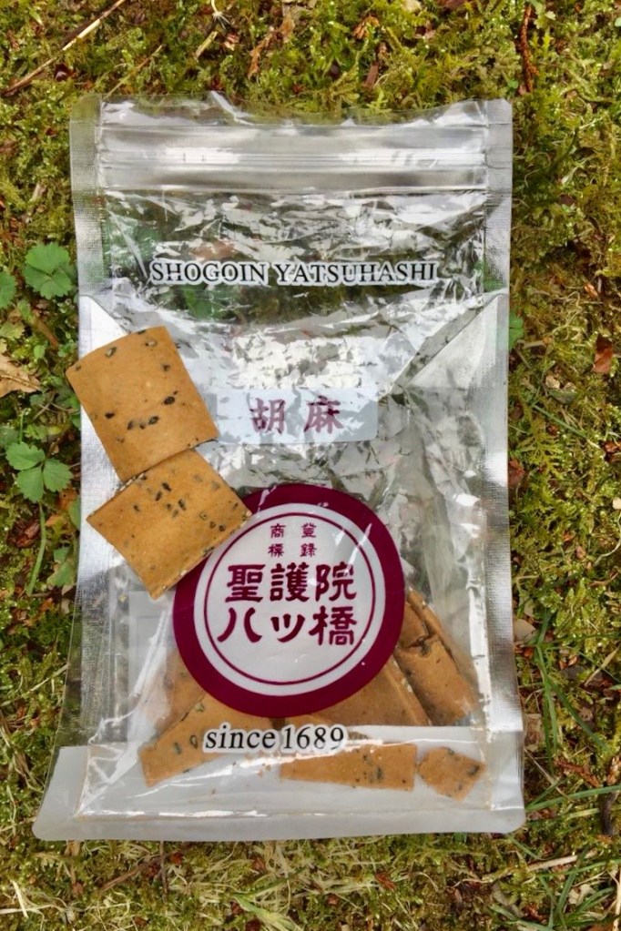 Biscoitinhos de canela e gergelim, em forma de telha, fabricados desde 1689, como consta na embalagem. E sushi de carne de cavalo.