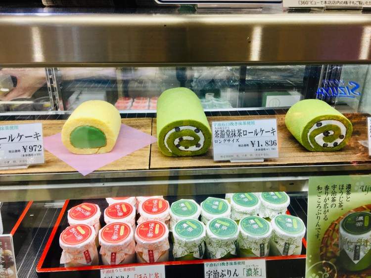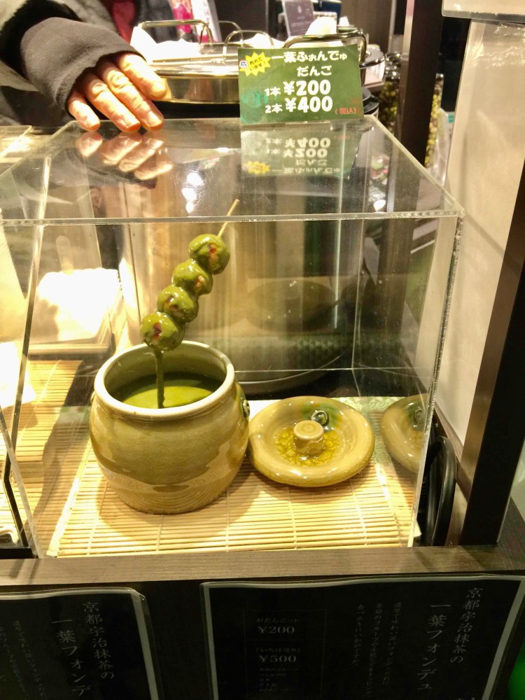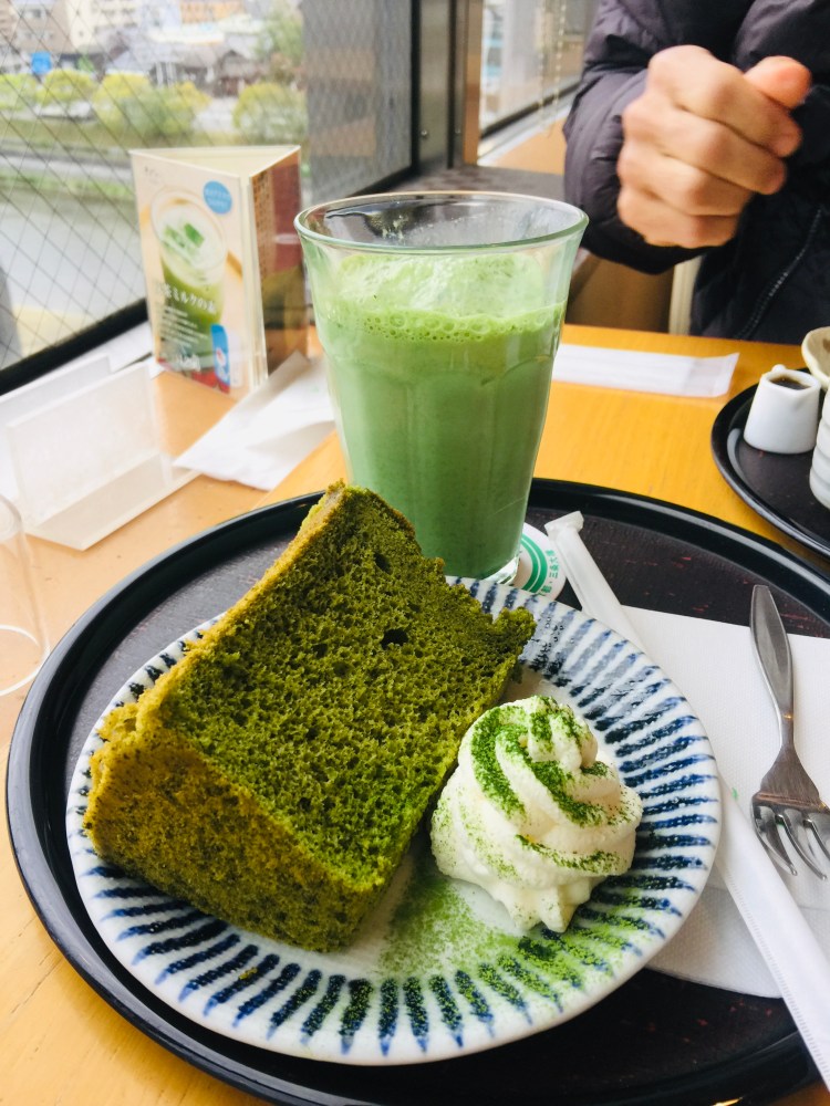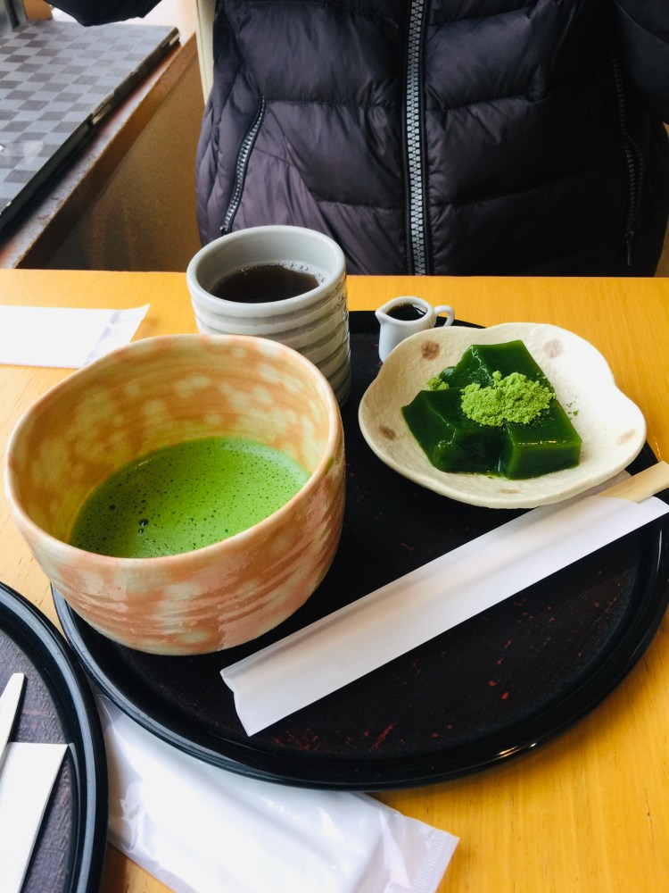 Uns espetinhos de uma massa doce, cujo nome não posso me lembrar; chá verde preparado by the book com gelatina de feijão e marcha; matcha Latte, bolo de chá verde e chantilly polvilhado com matcha.