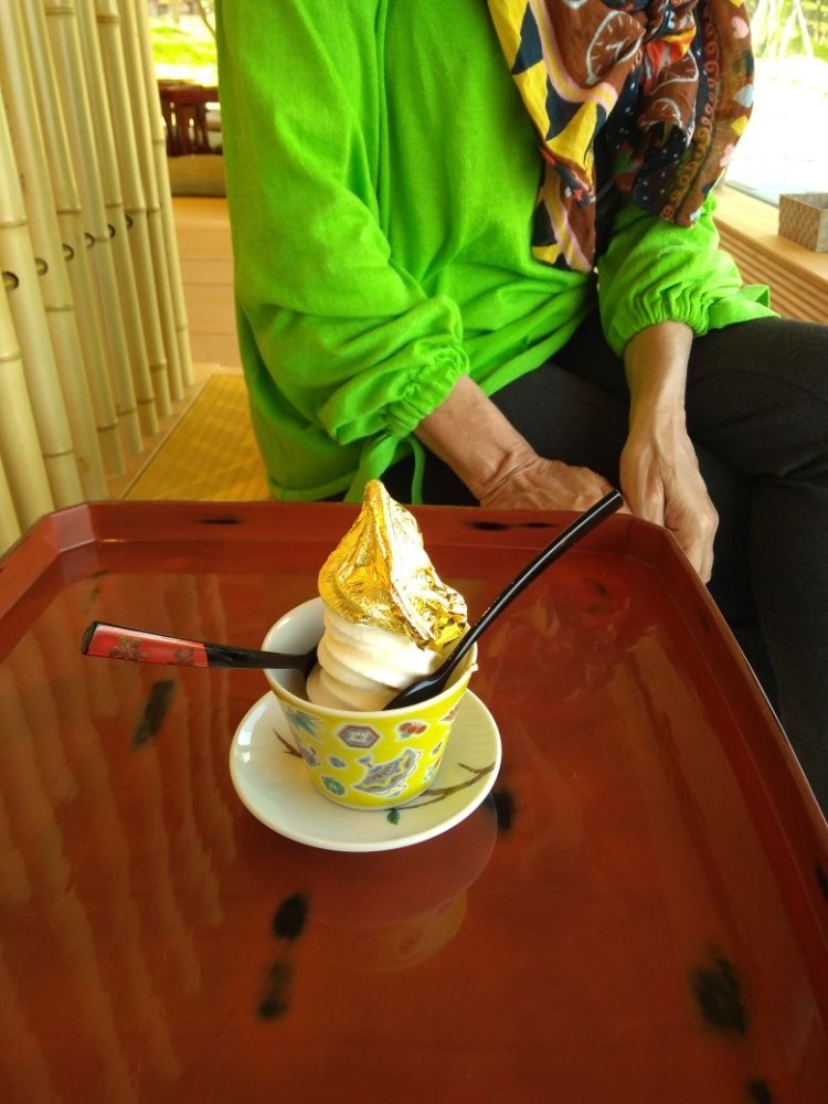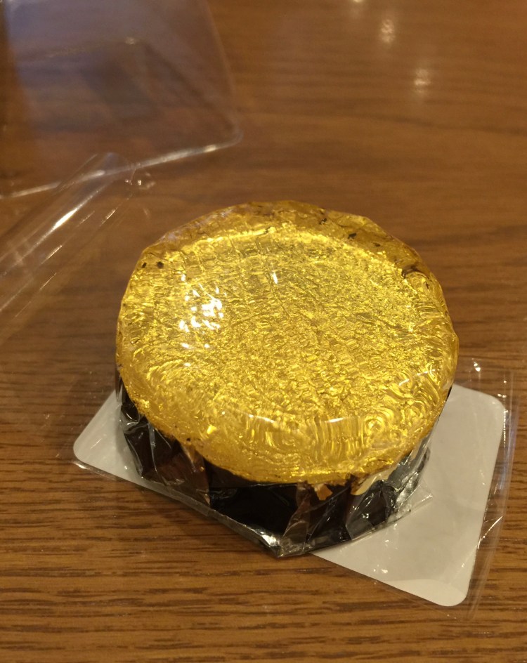 KitKat de saquê, sorvete folheado a ouro, tartalete de chocolate com cobertura de gelatina com pó de ouro.