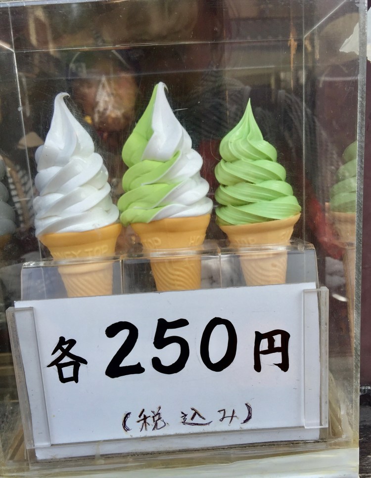 Biscoitinhos super pequeninos, carimbados um a um; e os sorvetes de matcha e creme.
