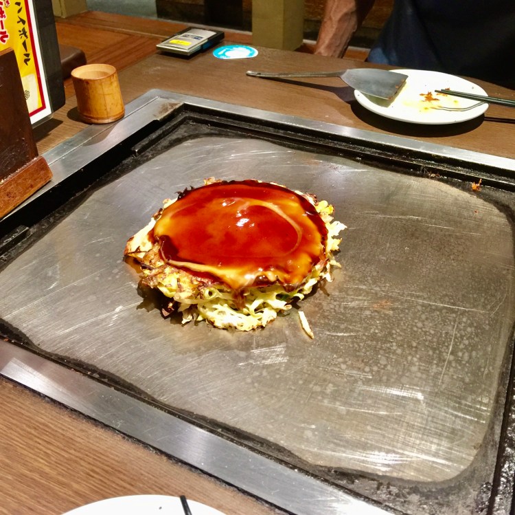 Foto 1 e 2 – OKONOMIYAKI, um prato originalmente de Hiroshima, feito com várias camadas de repolho, porco, carne, camarão, polvo e com um molho delicioso por cima. O restaurante tem mesas com chapa aquecida para o preparo da iguaria. O lugar tinha uma decoração bem interessante e frequência, idem.