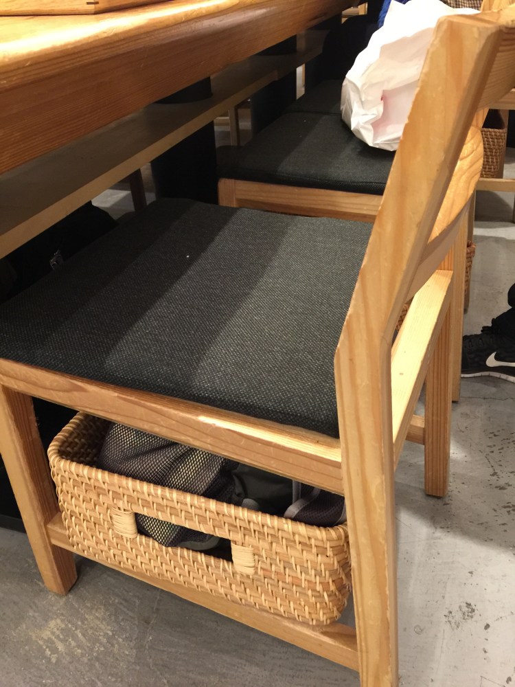 Cesta para guardar pertences. Nada de bolsa ou mochila pendurada no encosto da cadeira, para ser derrubada pelos passantes.