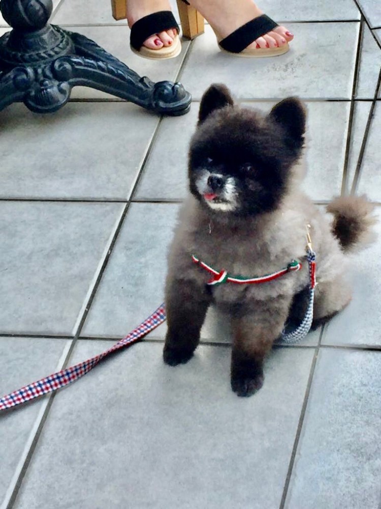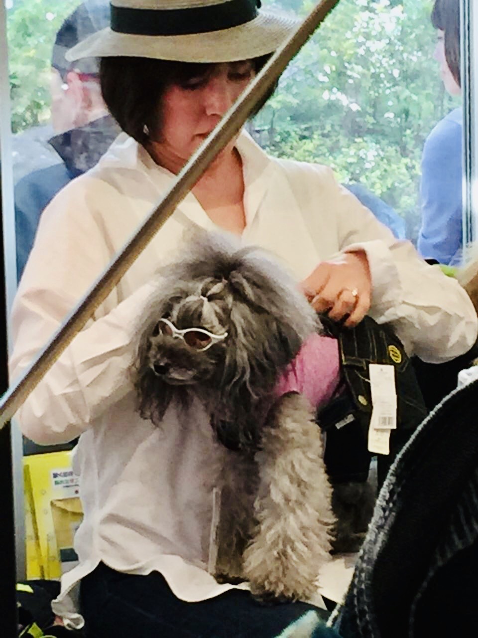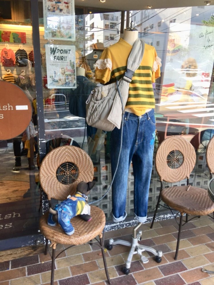 Aqui vi japoneses que curtem cachorros e lojas iguais às do Brasil. Macacão e camiseta iguais para o pet e seu dono. Cadelinha de óculos escuros. Vi também um dos poucos cachorros que encontramos na viagem.
