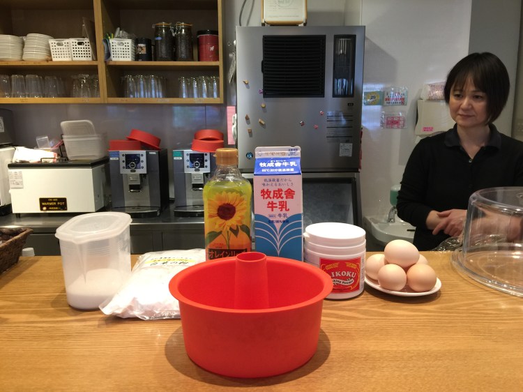 Vivi a experiência engraçada de ir um centro comercial com vários cafés e esculturas divertidas e conseguir a receita de um maravilhoso bolo. A moça, super gentil, arrumou os ingredientes no balcão e foi fazendo a mímica do preparo. Adorei. Fiz o bolo na volta e deu certo.