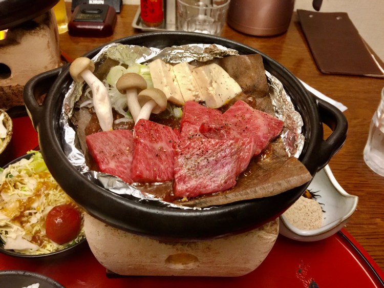 É também conhecida como Hida Takayama para marcar sua produção de Hida beef, carne tão especial quanto à famosa Kobe beef. Este gado é criado de um jeito característico, em liberdade quase que total, pastam por 14 meses e a pastagem fica em terras montanhosas. A textura da carne é super macia. O gado só pode ser criado por fazendeiros certificados. Comemos no restaurante Maruaki. A mesa tem grelhas para aquecer os pratos. A panela de pedra vem quentíssima para a mesa. Como eles terceirizam tudo 😉, o cliente termina de fazer o prato, para a carne não esfriar no trajeto da cozinha até a mesa. Tudo delicioso.