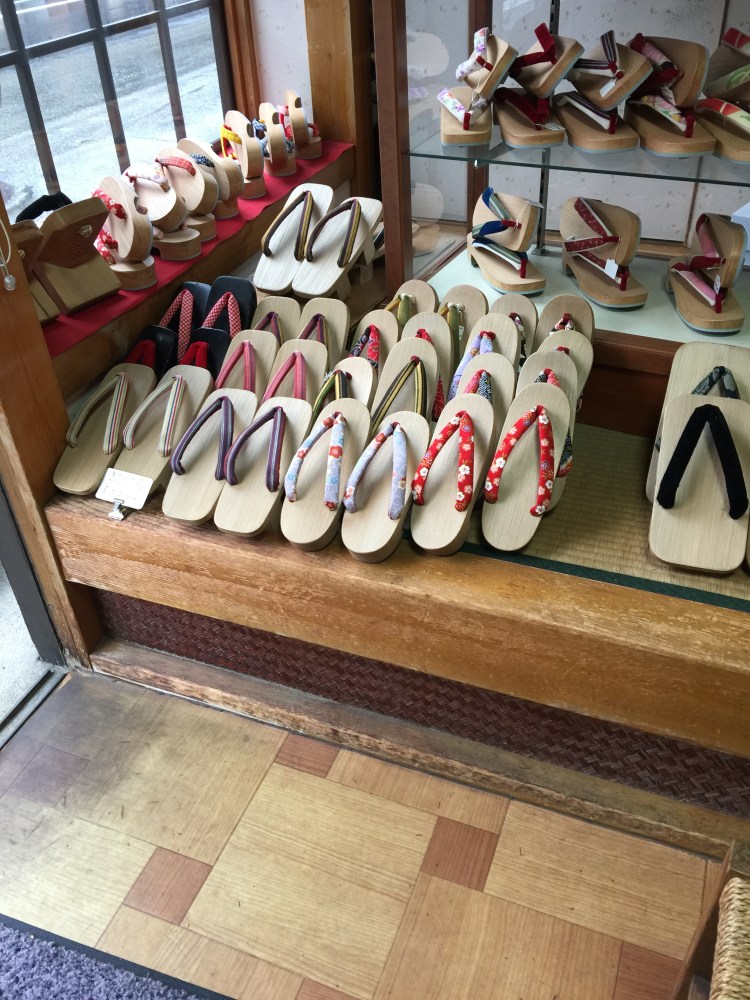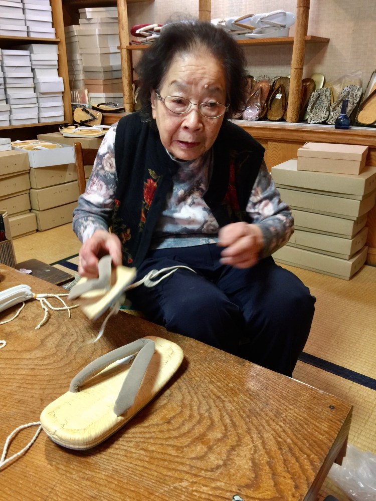 Gostei de ver em Takayama, idosas trabalhando de um jeito que a juventude quer recuperar. Trabalhando e morando num mesmo lugar. Entrei numa casa onde na frente tinha uma loja de tamancos, atrás a oficina e, na parte de cima, a habitação da proprietária. Uma senhora de 89 anos ainda fabricando tamancos, sentada em almofada no chão, e administrando sua lojinha.