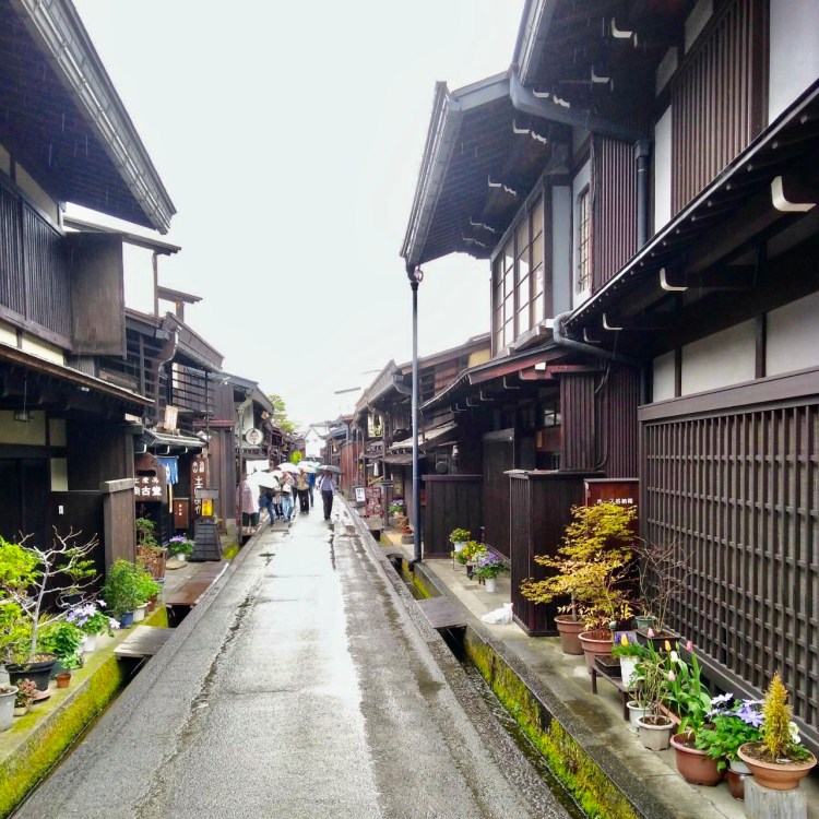 Para nós, Takayama foi a cidade perfeita para estar no meio da viagem. Localizada nos Alpes Japoneses, 3 cordilheiras de montanhas a mais de 3 mil metros de altura, situadas no centro do país, de quem nunca tinha ouvido falar, até começar a montar o roteiro de viagem. Pequena, com apenas 90 mil habitantes, é calmíssima, tudo desacelerando ás 6 da tarde. Lá vi, pela primeira vez, altos falantes nas ruas, tocando música clássica, para desacelerar o ritmo das pessoas. Tem um distrito histórico Sanmachi Suji, de clima feudal, com as casas de madeira de comerciantes do tempo do Período Edo. Abriga muitas construções do período, quando a cidade tinha um comércio muito forte, sendo o saquê o destaque. E para não ser diferente das demais, muitos pequenos museus e santuários.