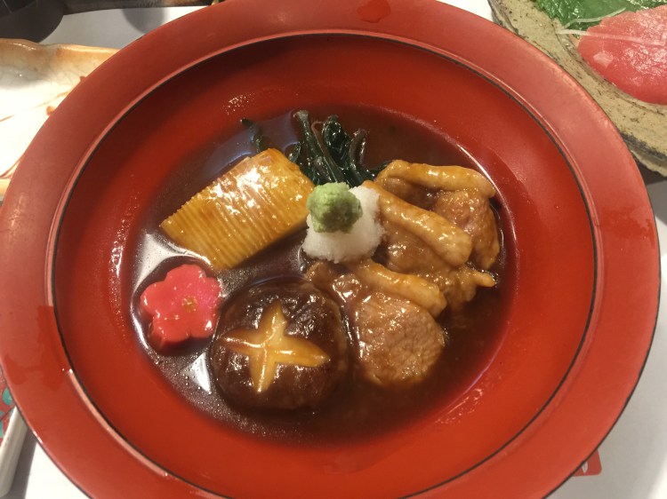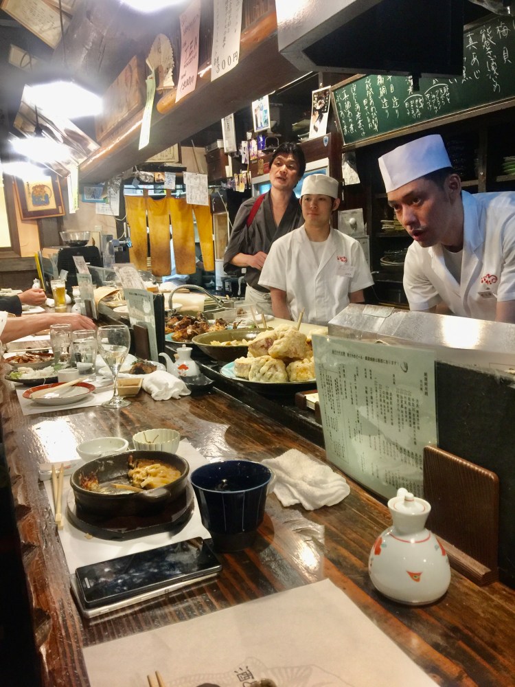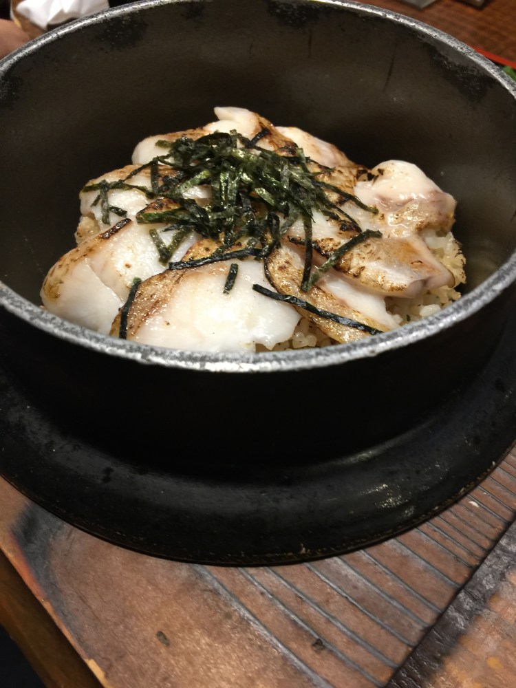 Depois de poucos dias no Japão, saquei a importância do arroz, na culinária. Quanto melhor e mais bem feito for o arroz, melhor será a refeição. Eu que pensava que ia me esbaldar em peixes e frutos do mar, descobri que eles são acessórios, uma coisa à toa que enfeita a tigela de arroz. Mas eu apreciei tudo: o arroz, os frutos do mar, frango, os 3 tipos de “macarrão”: ramens, udon ( um noodle grosso) e soba (feito de trigo integral) e os caldos. Jantamos num lugar comum, onde a comida é servida no balcão e o prato tinha um detalhe curioso. O item mais especial do prato era um caldo. Depois vinha o arroz, feito numa panela de ferro das antigas, com tampa de madeira para dar um odor especial. E, por último, e menos importante 😳 vinha o peixe. O caldo era contadinho e a instrução era de que ele devia bastar para umedecer todo o arroz. Tanto riquifife parece que deu mais sabor à comida. Estava ótima.