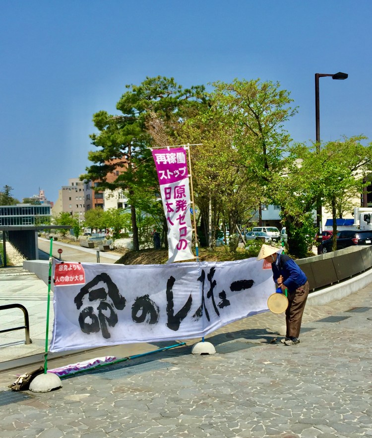 Acabamos parando para ver um protesto. Tenho uma filha do mundo da sociologia, antropóloga que ensinou minha alma matemática, apaixonada por tecnologia, a se interessar pelo mundo das ciências sociais. Um protesto calmo e solitário mas empenhado e observado por um transeunte e um policial que tenta desmentir uma má fama dos japoneses. 😉