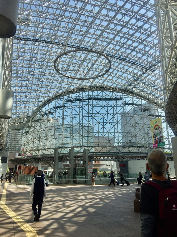 Chegamos lá, vindo de Magome e esperando uma modesta estação de trem. Foi uma surpresa só. O Japão prima nos detalhes. A todo momento nos surpreendemos com coisas inusitadas e a estação de Kanazawa não deixa por menos. Uma arquitetura com contrastes entre o novo de vidro e o antigo de ferro, um centro comercial muito grande, uma área externa ajardinada e com esculturas. Um conforto para os viajantes é que esta estação fica vizinha a dos ônibus, como nas outras cidades que visitamos. Para nós, foi especialmente conveniente porque de Kanazawa iríamos para Shirikawa-go e lá só se chega de ônibus. Demos uma rápida conferida e fomos para o hotel. Na volta, íamos ter mais tempo para dar um passeio por ela.