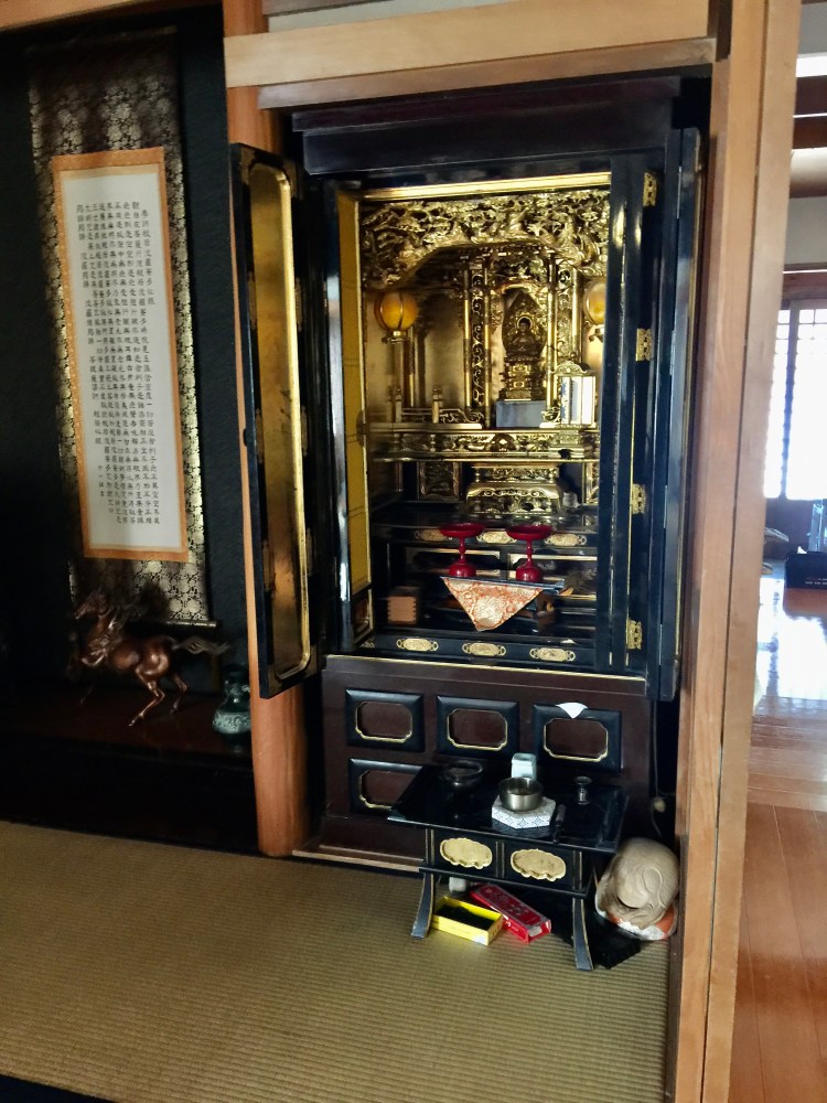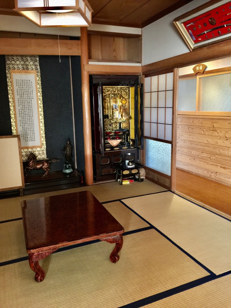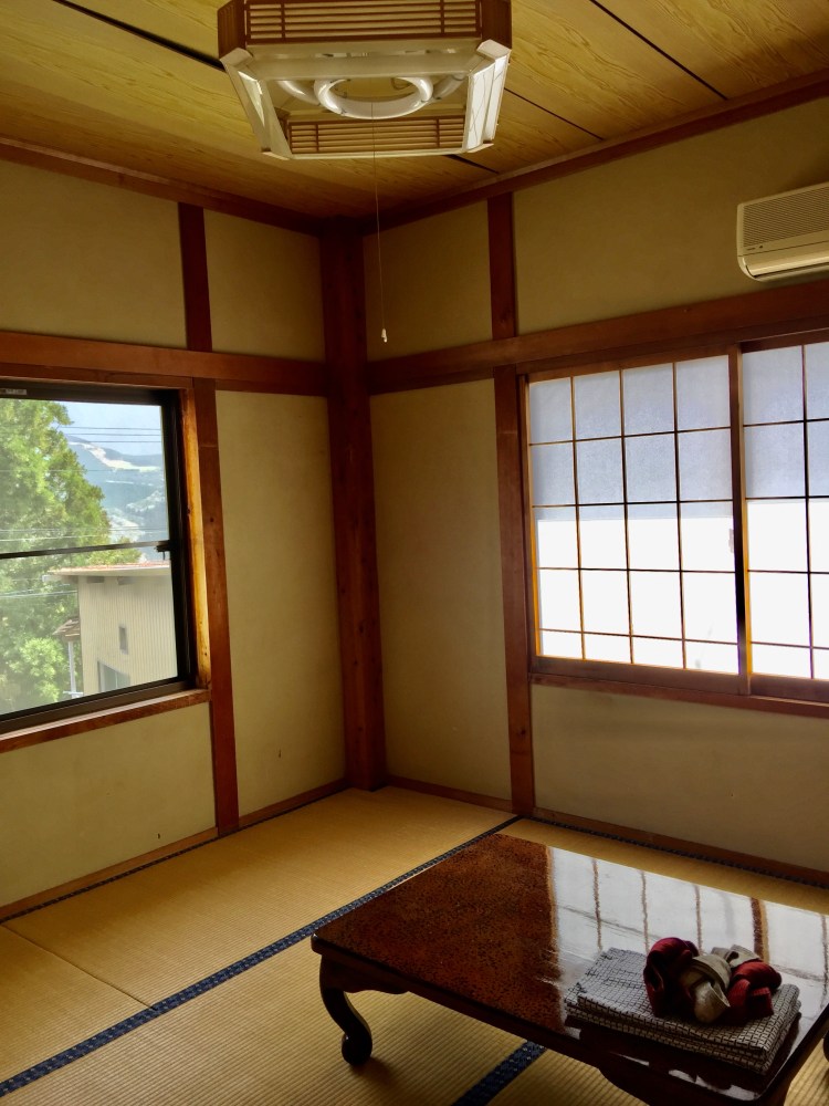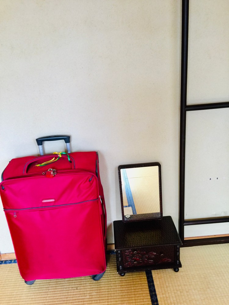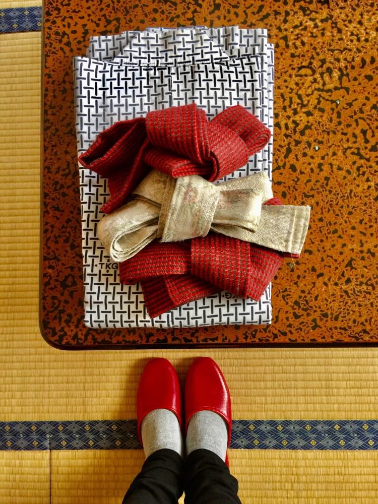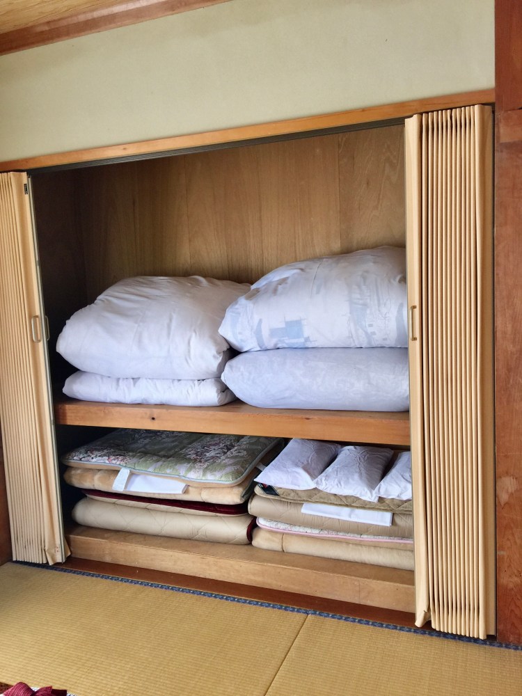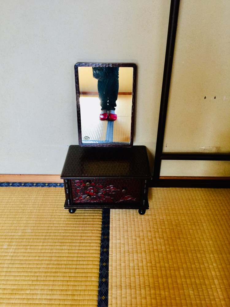 O quarto com pouquíssimos móveis: uma mesinha, um armário onde ficam guardados os futons e edredons que chamaram atenção com o jeito prático da capa e uma mini penteadeira. Adorei o travesseiro de trigo sarraceno. E o “mimo”do kimono de verão – o yukata – para brincar um pouco de ser japonês 😊