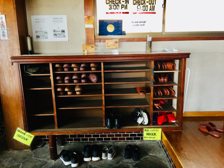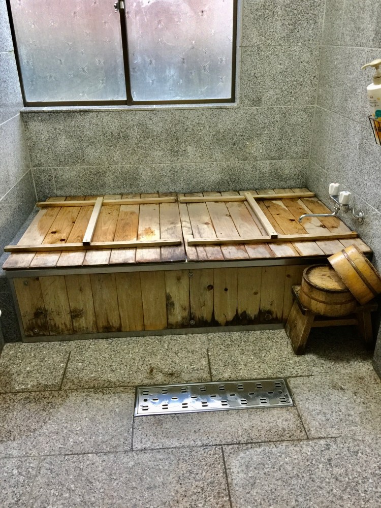 Aliás, este minshuku tinha jeitão de colégio interno. Antes do café da manhã e jantar, uma música era ouvida, um sinal sonoro lembrando os hóspedes para serem pontuais. Caso alguém perca o horário, a refeição nao é mais servida nem a pau 😊 Uma banheira de água bem quentinha e piso com esfoliante natural, para os pés 😊 E os tais banquinhos que eles usam para se banhar sentados. Eles levam a vida agachados 😊