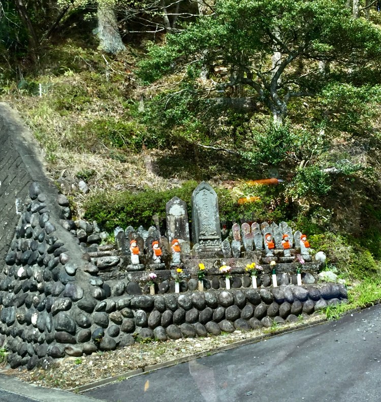 Magome é uma graça. Chegamos lá vindo de Kyōto, de trem, passando por Nagoya e Nakatsugawa e desta última, com ônibus. A estrada é linda e a surpresa foi que lá também tem os túmulos na beira da estrada, com as pedrinhas vestidas.
