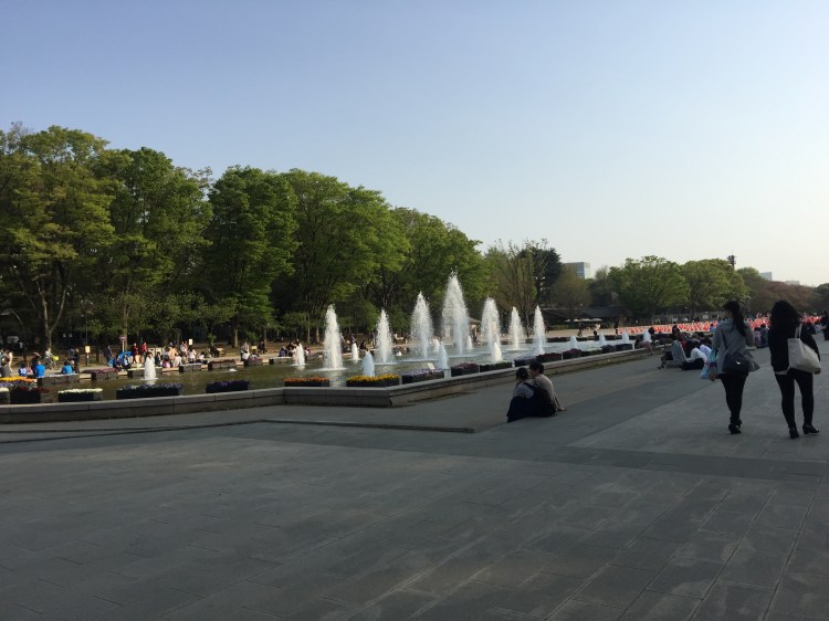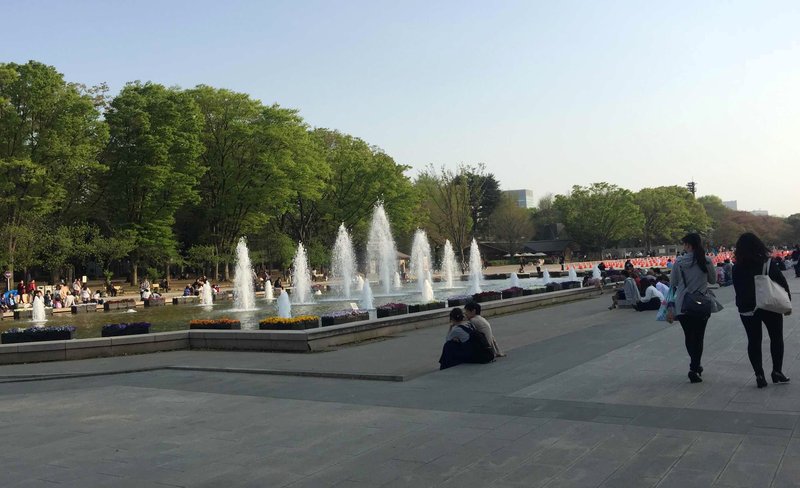 Este foi o primeiro parque público da cidade, aberto em 1873. Um amplo espaço com galeria de arte, museus, universidades, templos e um zoológico. Nesta época, é muito frequentado por causa da sakura ( floração das cerejeiras ). O costume local é fazer piqueniques sob as árvores.